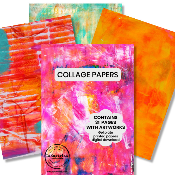 I hand-printed these papers in vivid colours so you can now print them and use them in your collages or mixed media artworks. With their bold colours and messy look they are a guaranteed joyful addition to any of your artworks! Have fun with them!